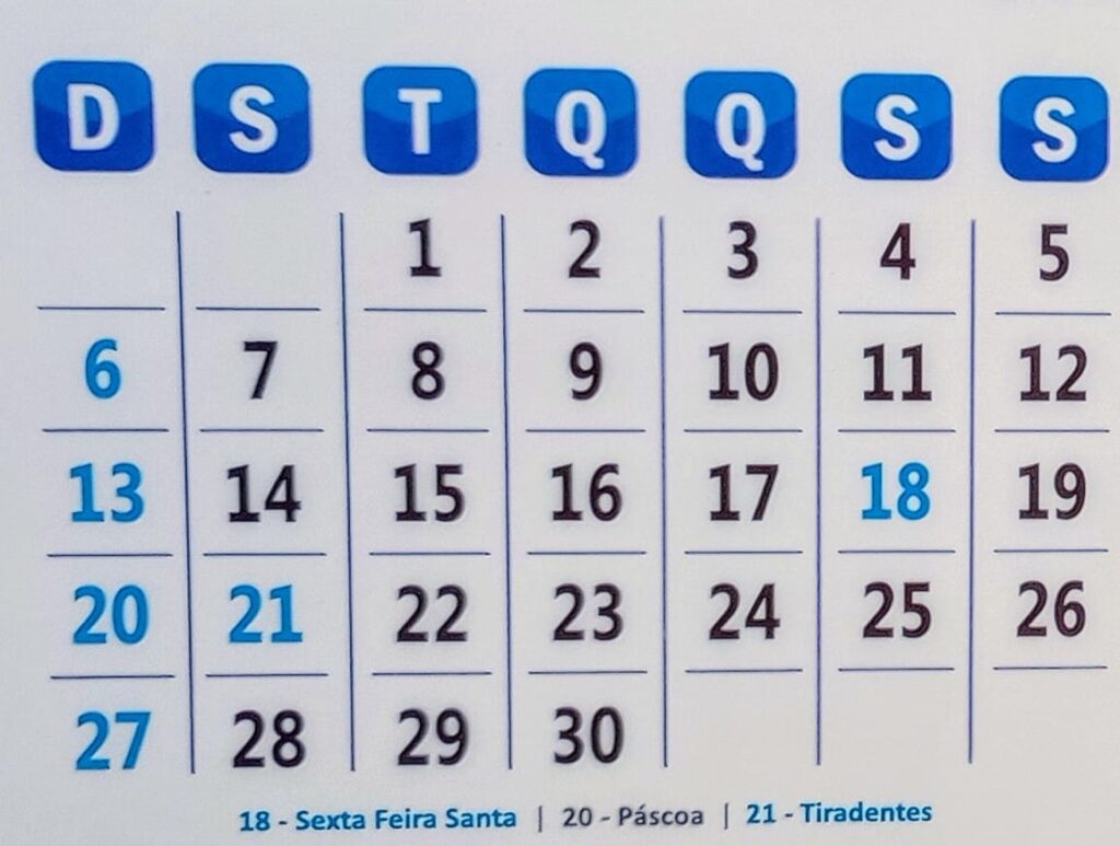 O Dia de Tiradentes cai na segunda-feira seguinte, dia 21 de abril, podendo proporcionar ao trabalhador quatro dias de folga seguidos.